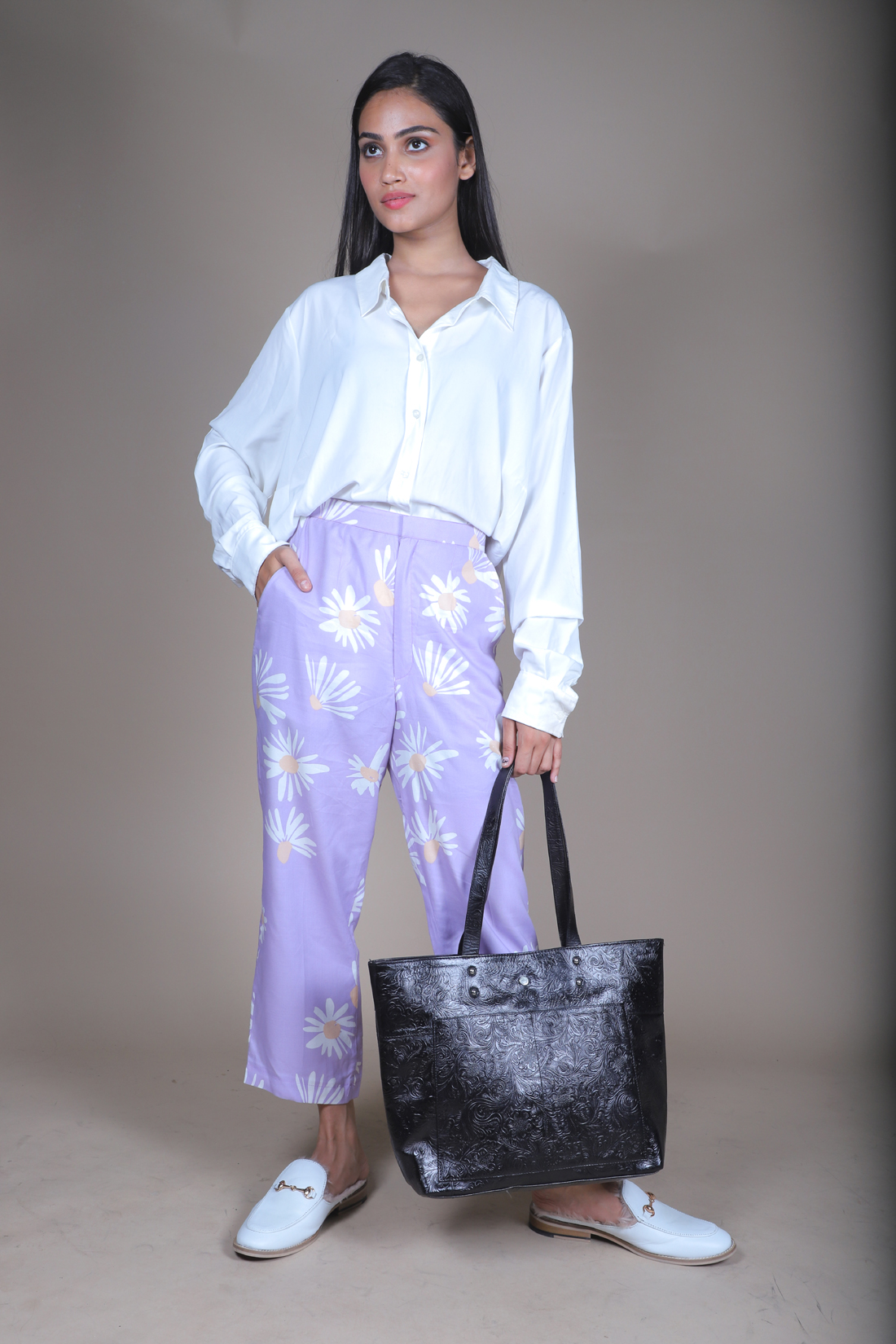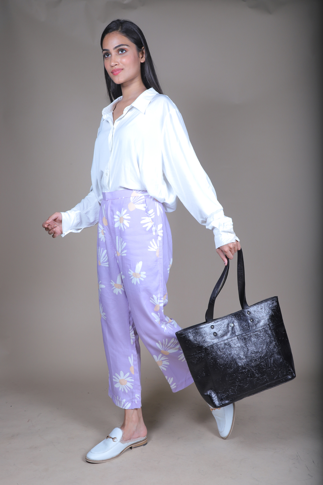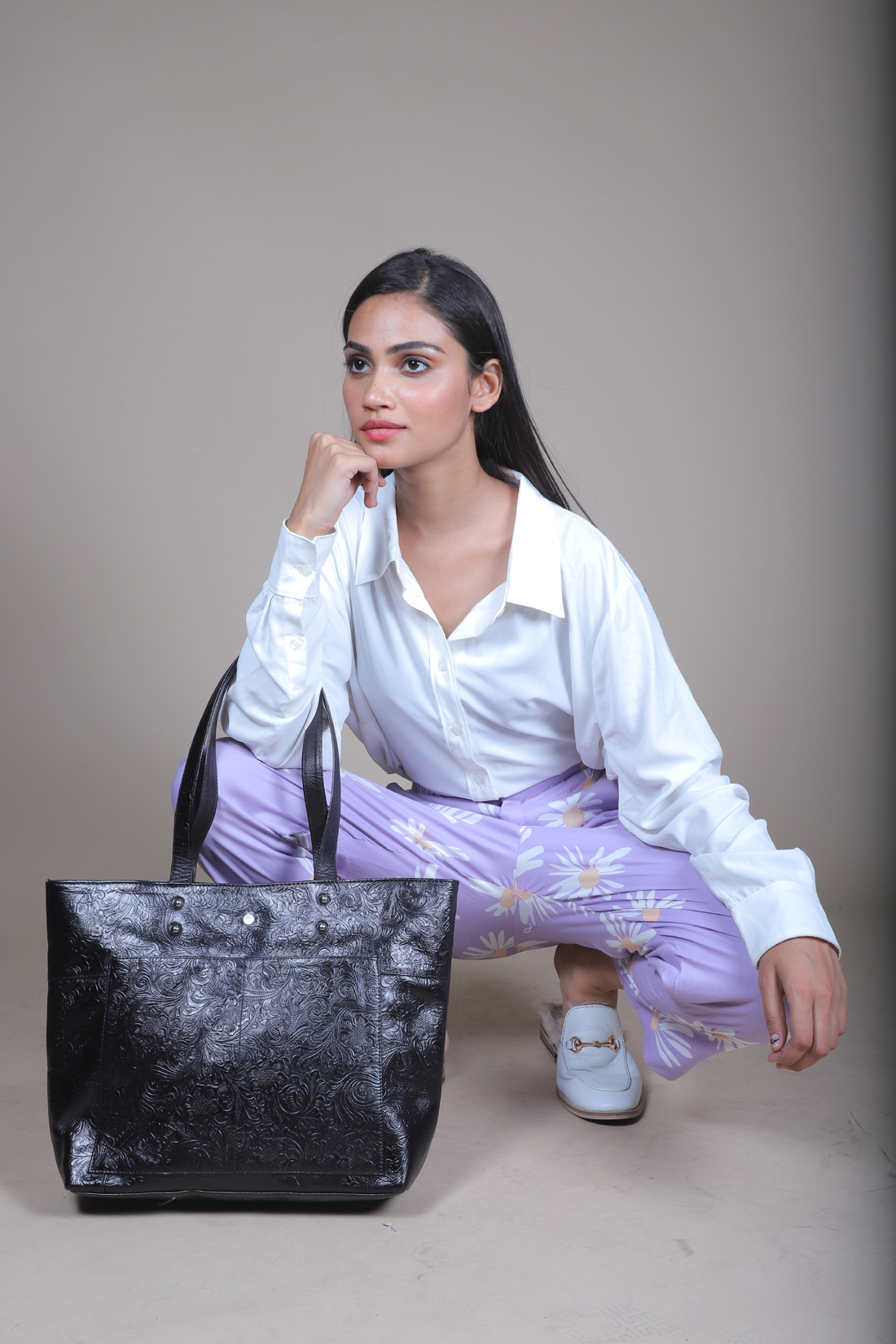 Tote Gift Bag : BEIGE SILK & BLACK SOFTY LEATHER BAG