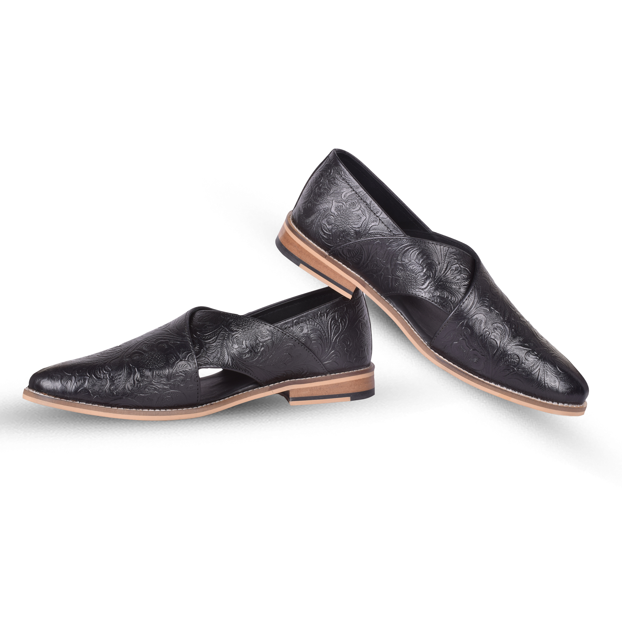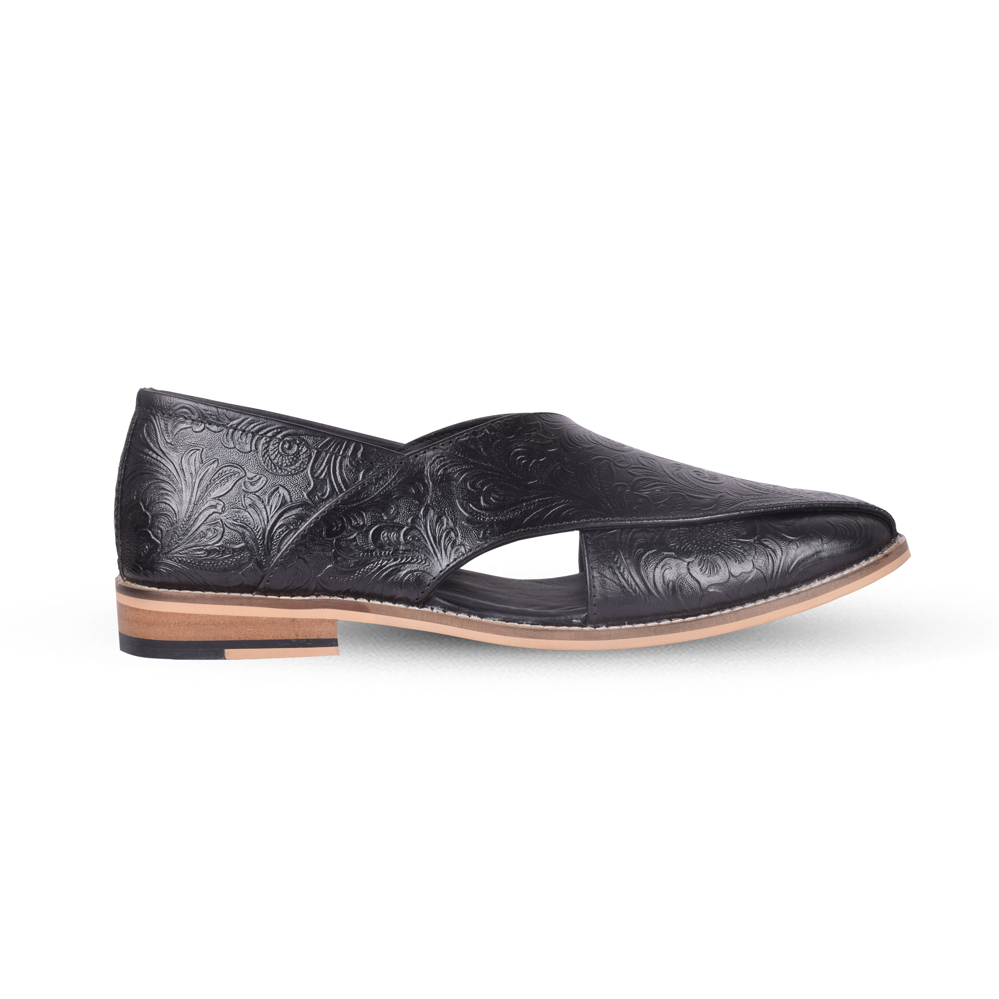 Peshawari Leather Sandals, Imported Leather upper, Softy Leather Lining with Memory Foam footpad for optimum comfort. Peshawari03_Flora_Black